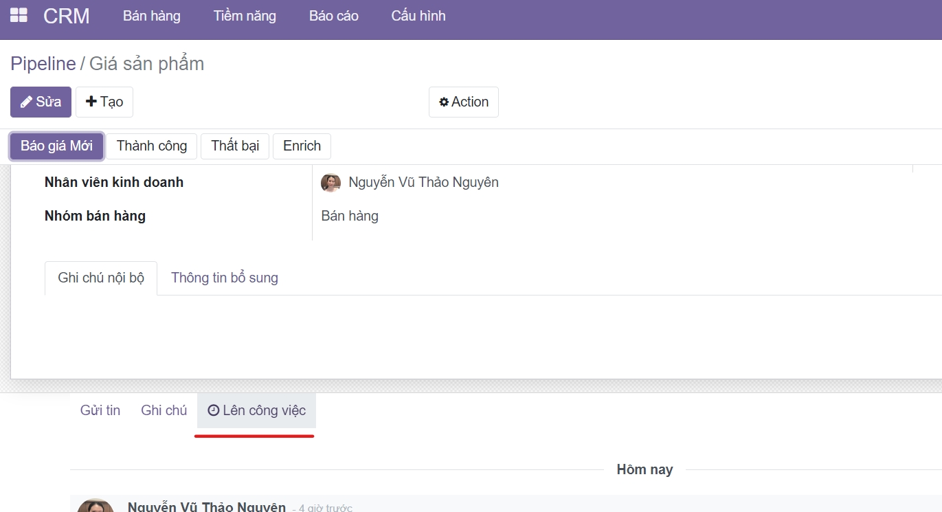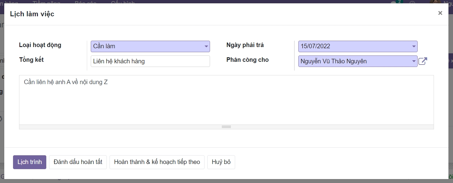 Nhập thông tin Loại Hoạt động, Ngày cần hoàn thành, Người cần làm và chi tiết Công việc như hình
