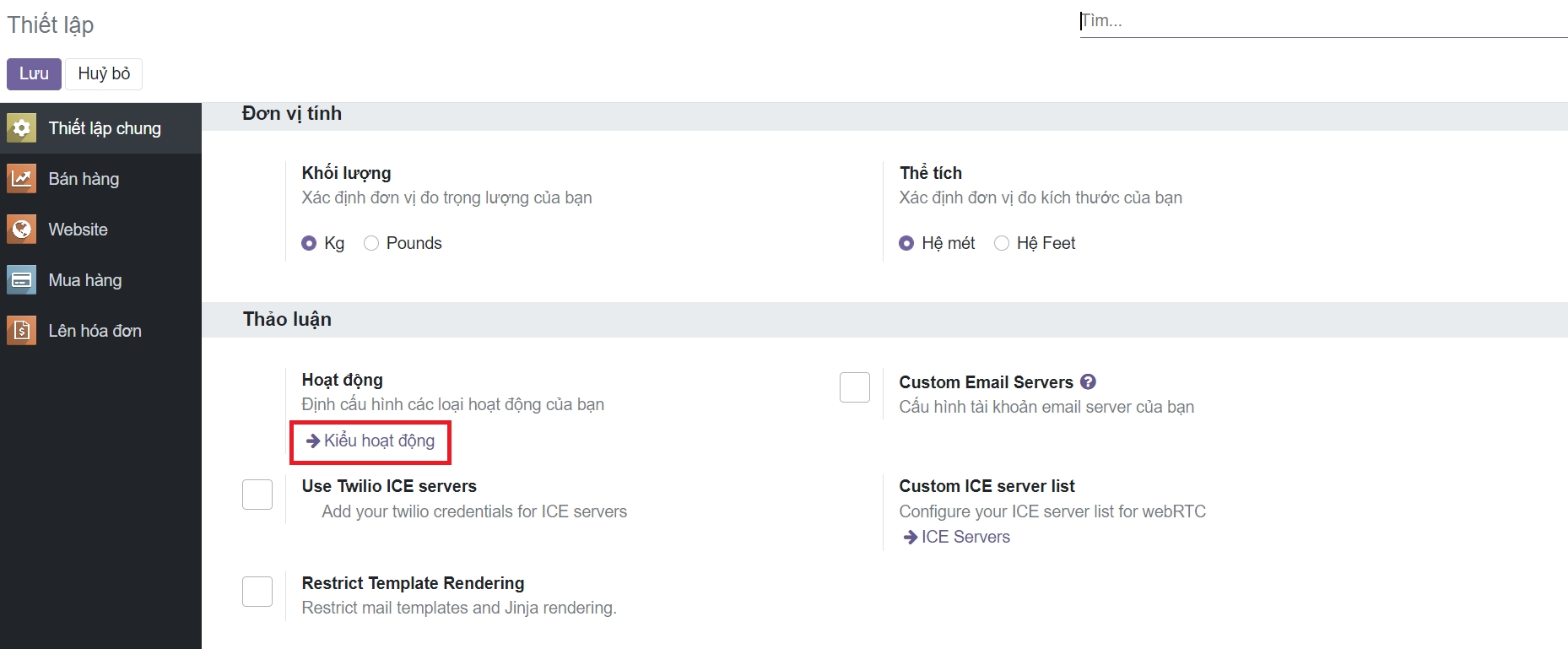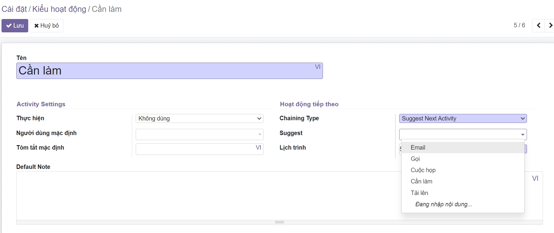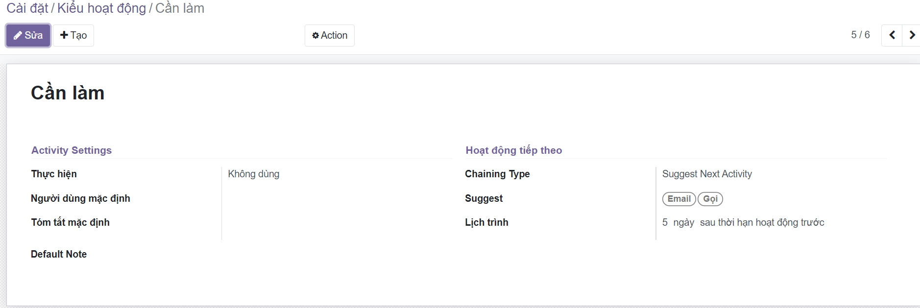 Một số loại hoạt động có sẵn theo mặc định trong Odoo (cuộc gọi, email, cuộc họp, v.v.). Tuy nhiên, bạn có thể đặt những cái mới trong Thiết lập ‣ Loại hoạt động.
