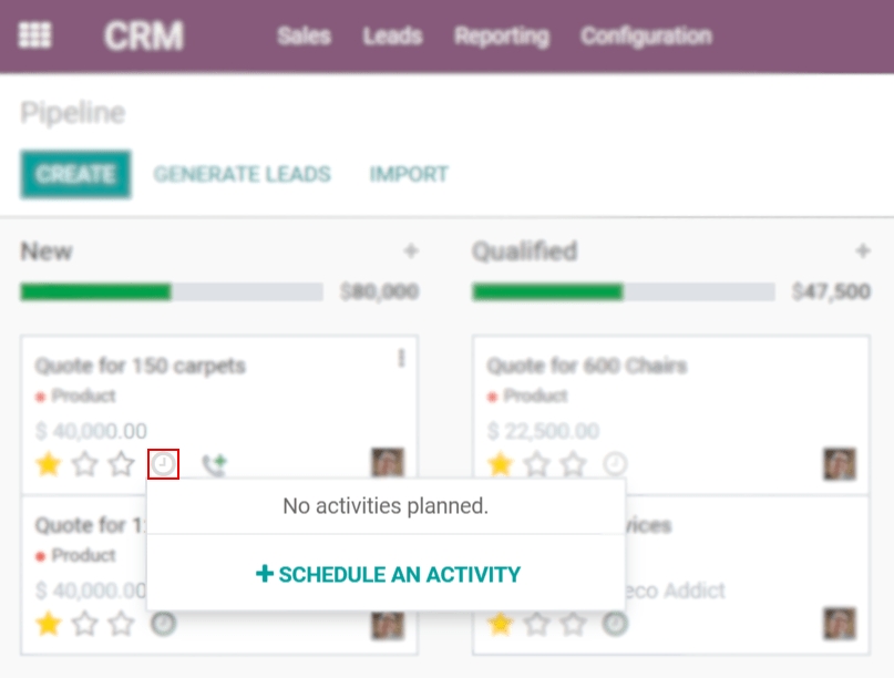 Truy cập và quản lý các hoạt động của bạn mọi lúc mọi nơi trong Odoo bằng menu Hoạt động.