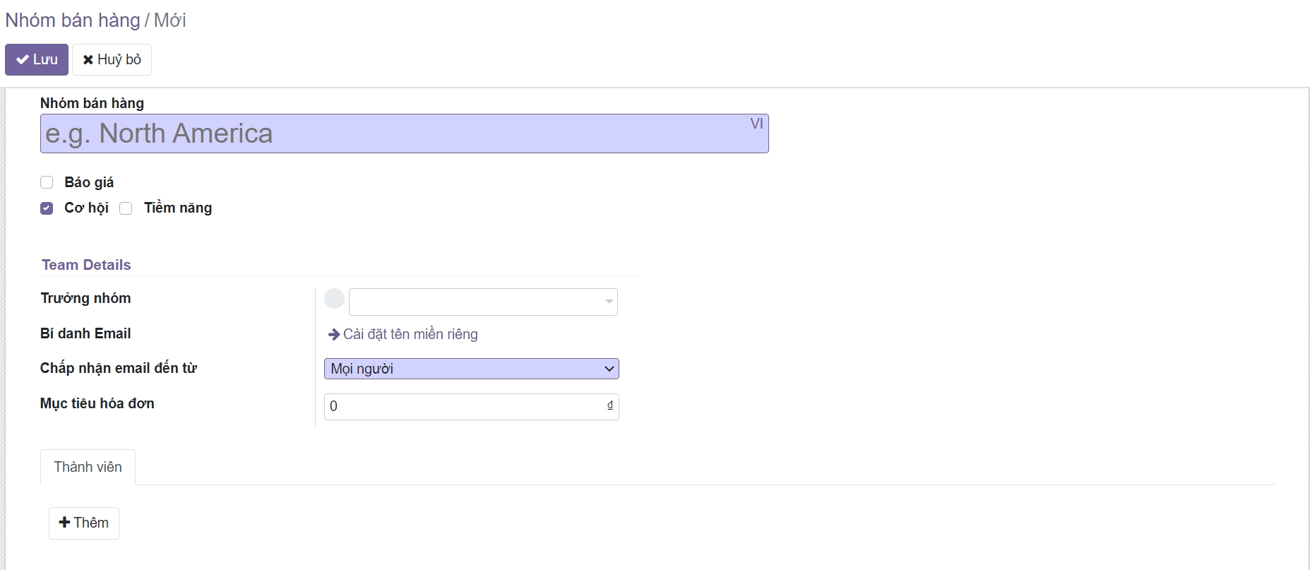 Đặt Miền để chỉ định khách hàng tiềm năng / cơ hội cho Nhóm bán hàng này dựa trên các bộ lọc cụ thể, chẳng hạn như quốc gia, ngôn ngữ hoặc chiến dịch. Đặt Mục tiêu lập hóa đơn nếu nhóm này có mục tiêu doanh thu hàng tháng cụ thể.
