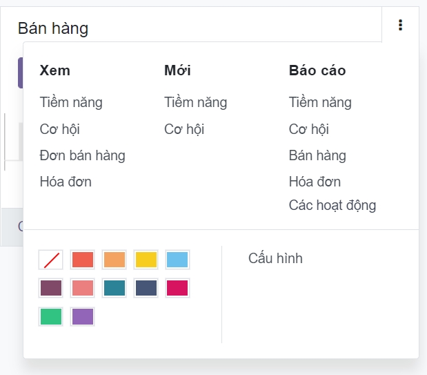 Nhấp vào ba dấu chấm ở góc của ô để mở menu điều hướng cho phép bạn xem nhanh các tài liệu hoặc báo cáo, tạo các trích dẫn hoặc cơ hội mới, chọn màu cho nhóm này hoặc truy cập trang cấu hình của nhóm.