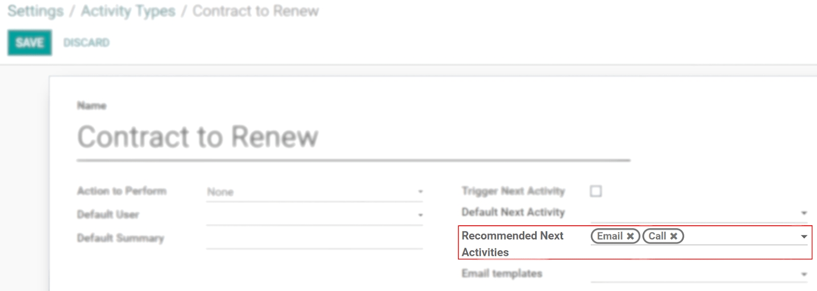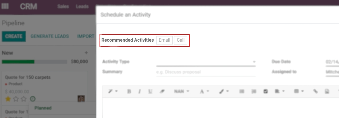 Odoo giúp kế hoạch luồng hoạt động bằng cách cho phép thiết lập các Hoạt động tiếp theo được đề xuất.