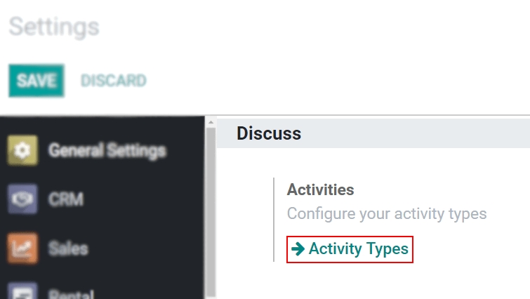 Một số loại hoạt động có sẵn theo mặc định trong Odoo (cuộc gọi, email, cuộc họp, v.v.). Tuy nhiên, bạn có thể đặt những cái mới trong Cài đặt ‣ Loại hoạt động.