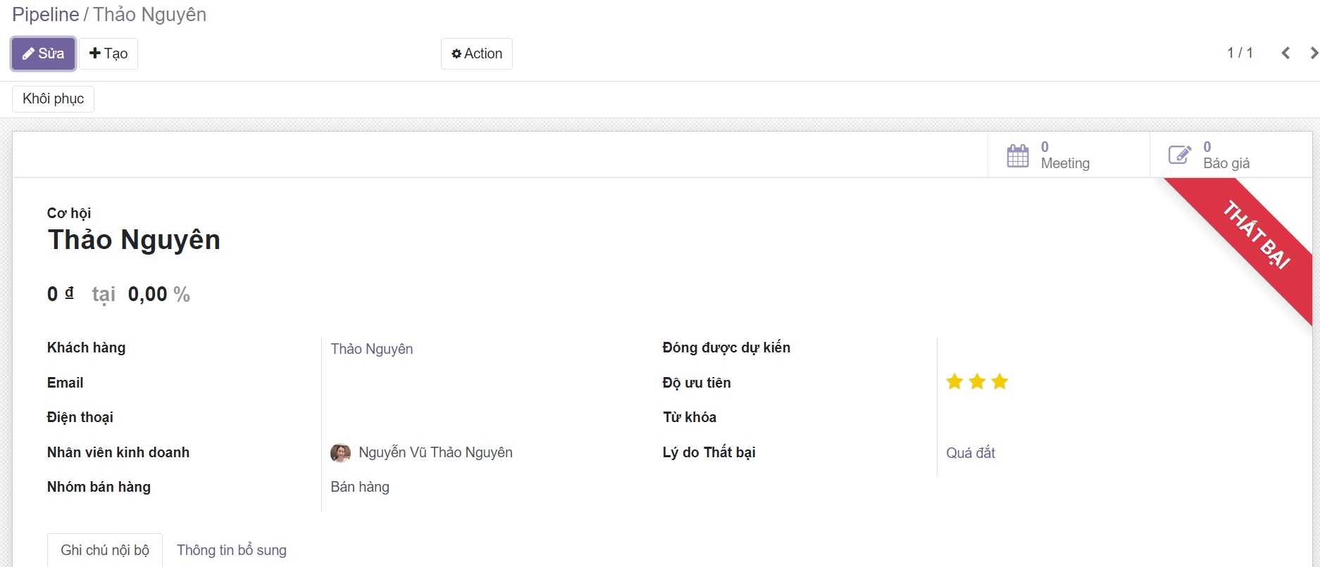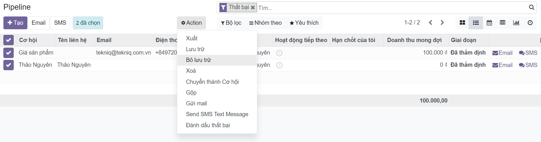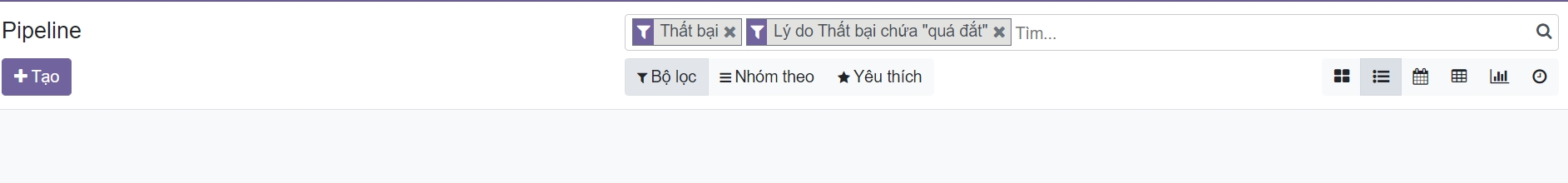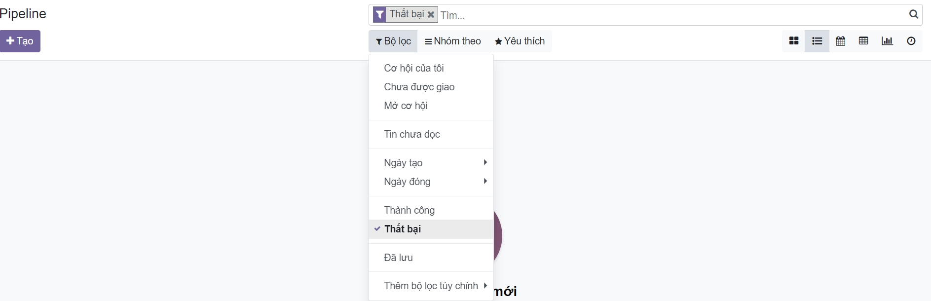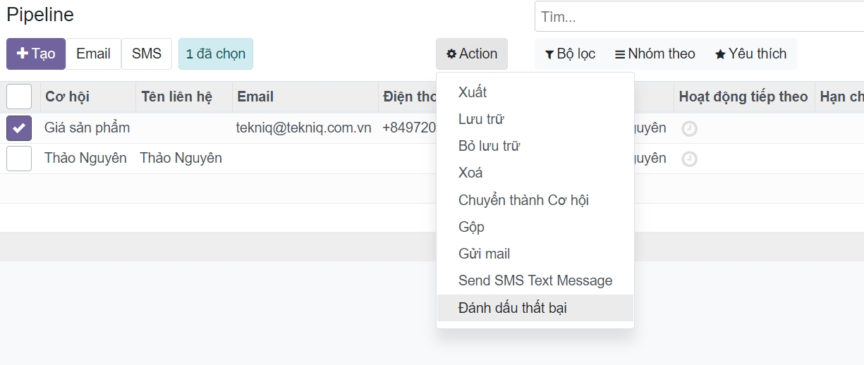 Để lấy lại các cơ hội đã thất bại và thực hiện các hành động đối với chúng (gửi email, thực hiện cuộc gọi phản hồi, v.v.), hãy chọn bộ lọc Thất bại (Lost) trong thanh tìm kiếm.