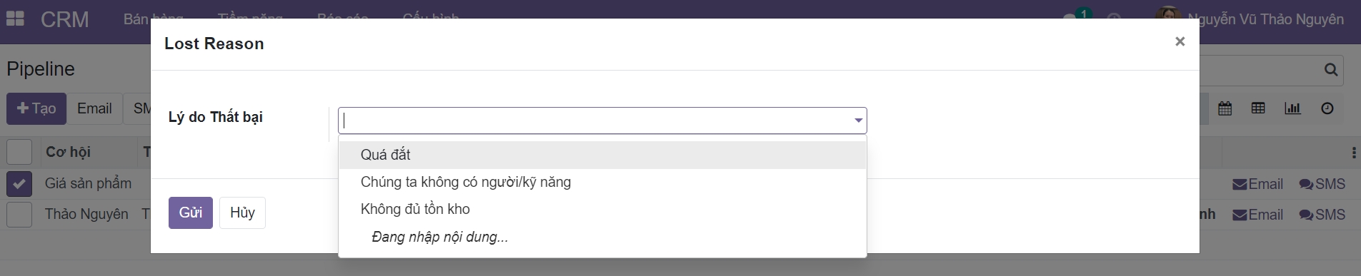 Sau đó, chọn một Lý do thất bại (Lost Reason) hiện có hoặc tạo một lý do mới ngay tại đó.