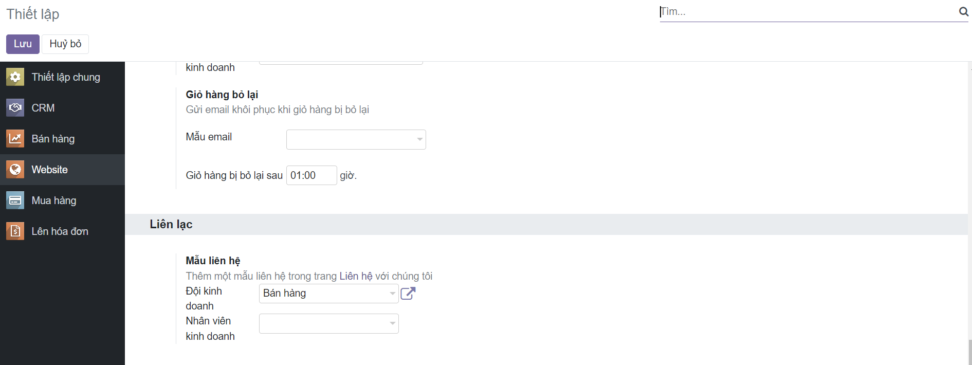 Chọn Nhóm bán hàng hoặc nhân viên bán hàng được tự động chỉ định cho các khách hàng tiềm năng / cơ hội được tạo từ Biểu mẫu liên hệ bằng cách đi tới Trang web ‣ Cấu hình ‣ Thiết lập ‣ Liên lạc.