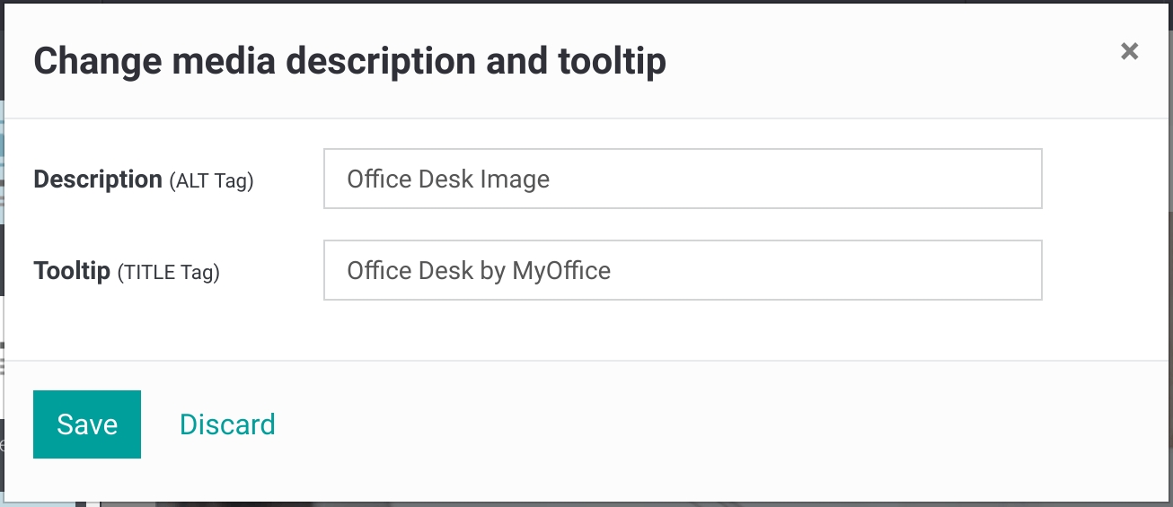 Khi bạn nhấp vào một hình ảnh, Odoo sẽ hiển thị cho bạn các thuộc tính Alt và title của <img> . Bạn có thể nhấp vào nó để đặt tiêu đề và thuộc tính Alt của riêng bạn cho hình ảnh.