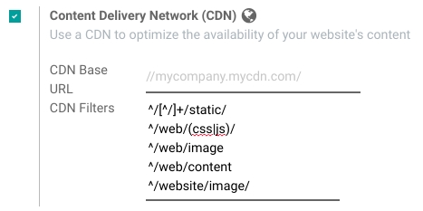 Nếu bạn kích hoạt tính năng CDN trong Odoo, các tài nguyên tĩnh (Javascript, CSS, hình ảnh) sẽ được tải từ Mạng phân phối nội dung. Sử dụng Mạng phân phối nội dung có ba lợi ích: