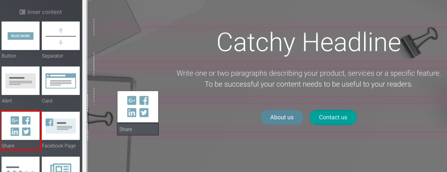 Thả khối xây dựng Chia sẻ trên bất kỳ trang nào bạn muốn khách truy cập chia sẻ. Bằng cách nhấp vào biểu tượng, họ được nhắc chia sẻ trang trên tường truyền thông xã hội của họ.