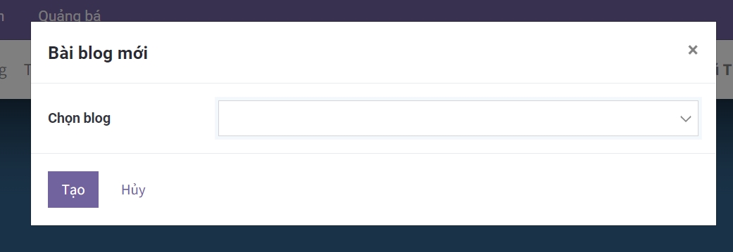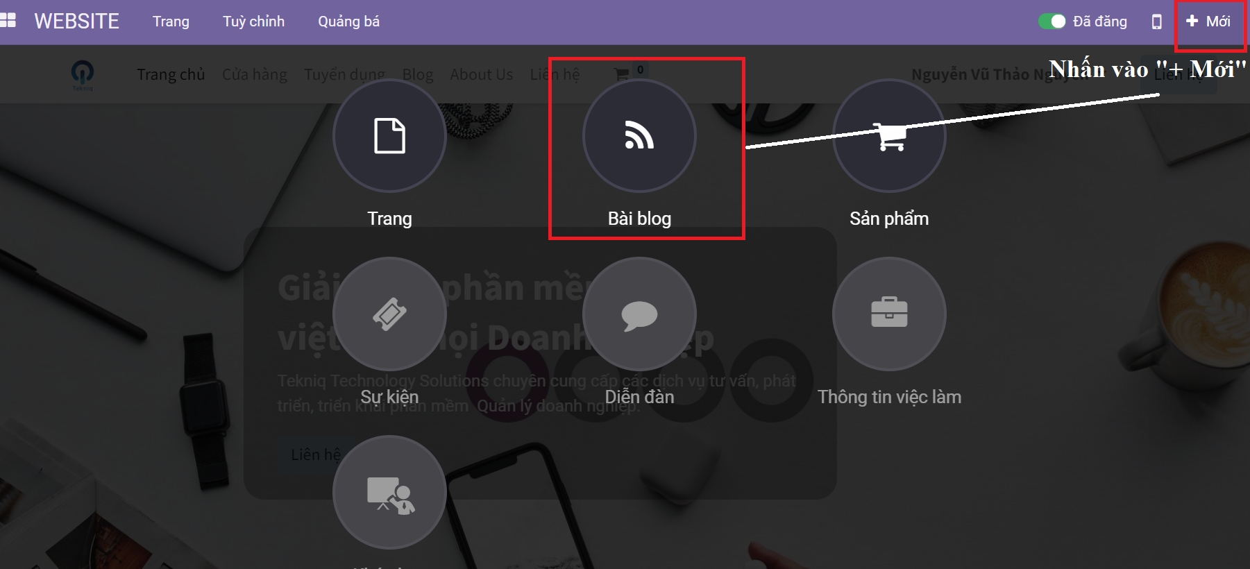 Để tạo bài viết (Blog) trên website bạn nhấn chọn "+ Mới" -> Chọn "Bài Blog" -> Tạo để tạo chủ đề mới.